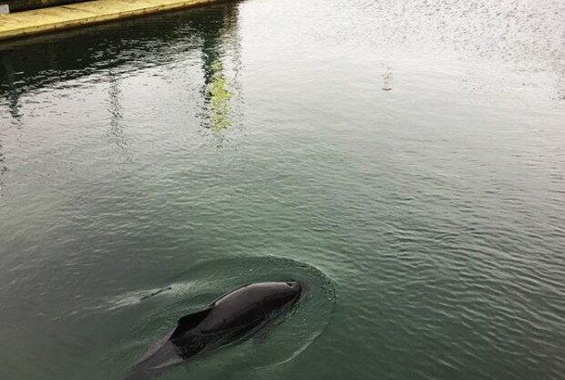 Marsvinet Freja, spærret inde i trangt havnebassin, hvor den lille hval bruges til forsøg og shows. Det vil flere partier nu have stoppet. Foto: Solbritt Beranek/World Animal Protection DK.